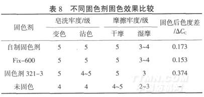 從表8可以看出,自制固色劑的應用效果與工廠來樣固色劑Fix-600相當,色牢度比未固色織物提高了0.5~1級.固色后織物色光基本不發生變化.