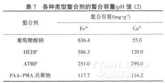 表7中所示各種螯合劑的螯合容量,葡萄糖酸鈉和HEDP對Fe3+的螯合能力特別強,但是對于Ca2+的螯合能力特別弱;ATMP對Fe3+和Ca2+的螯合能力很均衡而一般;PAA-PMA共聚物對Fe3+和Ca2+都較差,但具有分散能力,