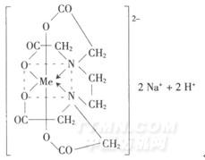 因此,表l中,對4種螯合劑,按lg K值次序都是相似的,即:Fe3+> CU2+> Ni2+>2n2+Mn2+>Ca2+> Mgz+.EDTA、NTA、HEDTA、DTPA與鈣、鎂離子有較強的螯合能力,絡合后形成螯合環結構,都是sp3雜化軌道配位鍵結合,構型為正四面體.EDTA(=鈉)與Ca2+、Mg2+的絡合物如下: