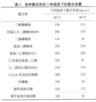 絡合穩定常數lg K-般隨溫度升高而下降,但影響程度不大,所以溫度對lgK的影響一般可以忽略.但是溫度升高對于螯合劑結合鈣的能力有影響,不同螯合劑的影響程度不同,表2為各種螯合劑在2種溫度下的螯合容量.