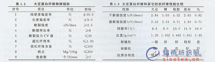 由表1.2和1.3看出,大豆蛋白纖維有良好的物理化學(xué)性能。此纖維不僅具有單絲纖度細(xì)、比重輕、強(qiáng)度高,耐酸堿性好等優(yōu)點(diǎn);而且大豆蛋白纖維還具有羊毛的保暖性和手感、蠶絲的柔和光澤、棉纖維的吸濕導(dǎo)濕性等優(yōu)良服用性能;此外,大豆蛋白纖維含有多種人體所必須的氨基酸,具有良好的保健作用、自然的抑菌性能,符合當(dāng)今消費(fèi)者崇尚綠色、古樸自然的消費(fèi)理念,同時(shí)可供大豆蛋白纖維染色的染料較多,因此大豆蛋白纖維是一種具有優(yōu)異性能的紡織新型原料。