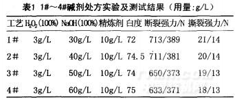 通過分析表1可知:1#~4#工藝處理的半成品白度基本差不多,強力損失程度1#工藝最小,斷裂強力、撕裂強力都比較高,效果最佳,4#工藝燒堿用量增多,但整體指標合格。