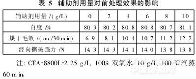 輔助劑的作用是提高體系的乳化、滲透和穩定性。將棉織物浸軋不同輔助劑用量的氧漂液中后汽蒸,測試處理后織物的性能,結果見表5。