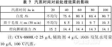 試驗所用為高支高密類織物,為提高紗線的平滑性,織造過程中通常會施加人工蠟。在前處理過程中必須予以去除,否則會出現蠟絲或毛效低等問題,影響后續染色的染深性和均勻性。將浸軋氧漂液后的棉織物汽蒸不同時間,測試處理后織物的性能,結果見表7。