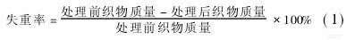 失重率    將織物于105℃烘箱中烘至恒重,置于干燥器中冷卻至室溫后,取出稱重。失重率按式(1)計算: