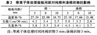由表2看出,隨著放電極板間距增大,純棉織物和滌棉混紡織物毛效、失重率和退漿率都逐漸降低。這是因?yàn)樵龃髽O板間距,兩極板間電場強(qiáng)度降低,且織物表面與極板間的距離也增大,激發(fā)的粒子到達(dá)織物表面時(shí)能量降低。所以,對于純棉織物和滌棉混紡織物最合適的極板間距都是3mm。以下凡涉及到等離子體處理的,純棉織物處理時(shí)間為5min,極板間距為3mm;滌棉織物處理時(shí)間為3min,極板間距為3mm。