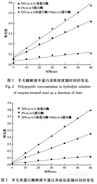 測試了不同酶處理工藝對羊毛纖維和羊毛角蛋白溶液的降解作用,水解液中蛋白多肽含量隨處理時間的變化如圖2、3所示。