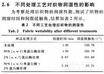 由表2可知,未處理的羊毛織物潤濕性很差。單獨使用角蛋白酶處理的織物,潤濕性稍有提高。因為角蛋白酶雖然能使羊毛鱗片的二硫交聯鍵打開,鱗片層中部分一S—S一還可能被還原成親水性的mSH或-sso~-’,但鱗片中的拒水性類脂層沒有被破壞,因此潤濕性改善較少。角蛋白酶+蛋白酶一浴法處理后,織物潤濕時間降低至3.88min,潤濕接觸角為95.71。潤濕性明顯改善。分析其原因可能為:角蛋白酶對二硫鍵的斷裂作用能使鱗片外層的可及度增大,纖維的親水性增強,蛋白酶更易攻擊鱗片內層,滲入纖維內部,水解皮質層和CMC;在蛋白酶的水解作用下鱗片表層的拒水性類脂物隨鱗片蛋白的水解而剝離,因此潤濕性提高。