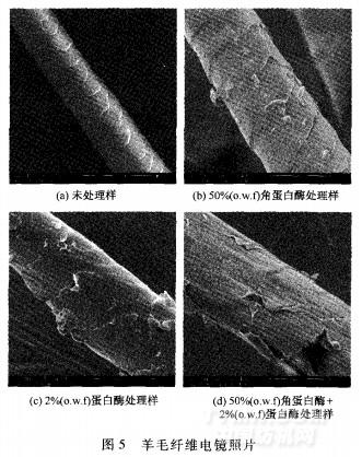 從圖5可看出,未處理羊毛纖維表面鱗片完整光滑,輪廓清晰,排列緊密。單獨使用角蛋白酶處理后,羊毛鱗片依然很完整,只是邊緣有一點凸起。這是因為單獨使用角蛋白酶處理對鱗片的降解不夠強烈,鱗片破壞不明顯。單獨使用蛋白酶處理后,羊毛纖維表層變得粗糙,鱗片張開且邊緣翹起,說明蛋白酶的水解作用主要是針對鱗片細胞問復合物。經角蛋白酶+蛋白酶一浴法處理后,羊毛表面鱗片明顯受到破壞,大部分鱗片已基本剝離,纖維表面變得光滑。說明角蛋白酶+蛋白酶一浴法處理的降解效果相當強烈,羊毛鱗片已基本剝離。