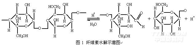 本方法采用60%的硫酸溶液,溶解莫代爾/棉纖維混紡產(chǎn)品中的莫代爾纖維,不溶物為棉纖維。溶解機(jī)理為:纖維素大分子的1,4-甙鍵對(duì)酸的穩(wěn)定性很低,在適當(dāng)?shù)臍潆x子濃度、溫度以及時(shí)間條件下,會(huì)發(fā)生水解而降解,使相鄰兩葡萄糖單體間碳原子和氧原子所形成的化學(xué)鍵發(fā)生斷裂。過程初期,試劑迅速滲入纖維的無定形區(qū),使這個(gè)區(qū)域的大分子降解,這時(shí)水解速率很快,當(dāng)無定形區(qū)全部被破壞后,由于試劑向結(jié)晶區(qū)內(nèi)滲透較為困難,所以只能使結(jié)晶區(qū)發(fā)生由表及里的水解反應(yīng),這時(shí)水解反應(yīng)速率明顯降低,同時(shí)纖維素發(fā)生解體。因此,可以利用棉纖維與莫代爾纖維的聚合度、結(jié)晶度等性質(zhì)差異,選擇一定濃度的硫酸溶解莫代爾纖維,剩余棉纖維,由試驗(yàn)獲得棉纖維的重量修正系數(shù),然后計(jì)算得到兩組分的含量即混紡比例。水解過程示意圖見圖1。