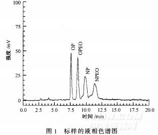 以O(shè)P,OPEO,NP,NPEO的混合標(biāo)準(zhǔn)溶液(OP的質(zhì)量濃度為0.25mg/L,其它均為0.5mg/L),采用不同的流動(dòng)相和分析條件進(jìn)行測(cè)定,結(jié)果表明,當(dāng)流動(dòng)相為純甲醇時(shí),只出現(xiàn)2組色譜峰,第1組色譜峰是OP和OPEO產(chǎn)生的,第2組色譜峰則對(duì)應(yīng)于NP和NPEO,且這2組色譜峰也未能完全分離。當(dāng)流動(dòng)相V(水):V(甲醇)=10:90時(shí),分離效果有所改善,OP與OPEO之間基本能完全分離,但NP與NPEO之間未能完全分離。當(dāng)流動(dòng)相V(水):V(甲醇)=15:85時(shí),各色譜峰能完全分離,但NPEO的色譜峰峰形較差。在流動(dòng)相中加人一定量的乙睛可以進(jìn)一步改善分離效果,分別選用V(水):V(甲醇):V(乙睛)=10:86:4、15:81:4,15:75:10,13:81:6,13:82:5,14:81:5的溶液作為流動(dòng)相,研究其分離效果。結(jié)果表明,當(dāng)流動(dòng)相v(水):V(甲醇):V(乙睛)=13:81:6時(shí),各色譜峰峰形尖銳,分離效果也比較好,如圖1所示。因此,確定流動(dòng)相為V(水):V(甲醇):V(乙睛)=13:81:6。