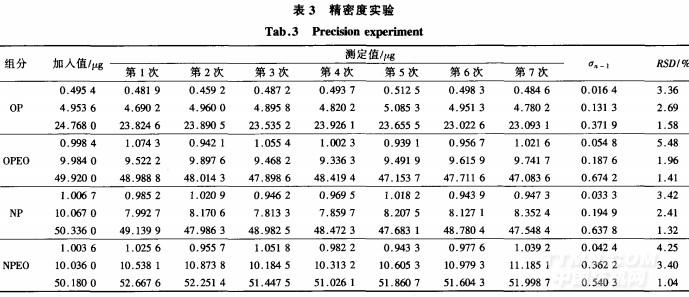 采用添加法在待測樣品中添加3個不同質量濃度水平的OP,OPEO,NP和NPEO,進行回收率測定。每個水平單獨測定9次。結果表明,其回收率為96.82%~103.39%。