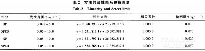 在本文確定的實驗條件下,OP和OPEO,NP和NPEO分別在0.025~5.0mg/L及0.05~10.0mg/L范圍內與響應值有很好的線性關系,各化合物的線性范圍、線性方程及其相關系數見表2。采用標準溶液檢測限(SIN=5)作為方法的檢測限,結果也列于表2中。