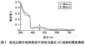 圖4表明,染色時(shí)間由30min延長到60min時(shí),流體染浴中染料的特征吸收峰明顯降低,表明當(dāng)溶解染料進(jìn)人染色釜并與真絲纖維接觸時(shí),染料在纖維上發(fā)生吸附上染,從而使流體中溶解染料濃度降低。此外,流體染色時(shí)盡管采用了1:1000的大浴比,但在60min的染色時(shí)間內(nèi)也可使流體染浴中染料濃度明顯降低;而傳統(tǒng)水浴染色時(shí),通常染浴中染料濃度的變化較小。這也表明超臨界CO2流體染色有助于提高染浴中染料向纖維表面的轉(zhuǎn)移或吸附上染,從而可有效提高活性分散紅GG染料在真絲纖維上的上染百分率。