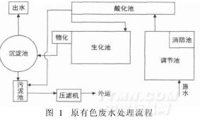 染整廢水一般采用單獨的物化或生化手段難以達到排放標準[1]。本工藝在原有生化處理設施的基礎上,對處理構筑物進行改造,采用有色水與無色水分開處理的方法,使無色水處理達到回用目的,有色水經深度處理并達標后排放。