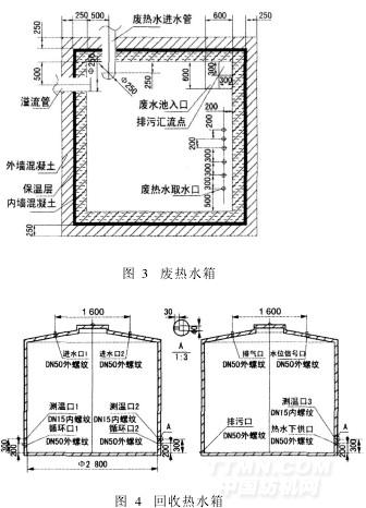 該分系統的功能是負責各種能源介質的輸送和儲存。系統設有廢熱水箱(圖3)、回收熱水箱(圖4)及輸送管路,根據實際生產需要及時儲存或供應熱水。該分系統采用先進的保溫結構及保溫材料,實現了回收過程熱能損失的最小化,保溫熱水水溫每24h只下降1~3℃。