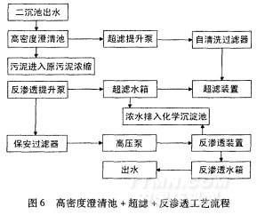 為了回用處理后的水,實現能源的綜合利用,魯泰公司采用“高密度澄清池+超濾+反滲透”工藝,投資建設中水回用系統。生產中水可用于染整用水、生產清潔用水、環境綠化用水,目前已進人中試階段。高密度澄清池+超濾+反滲透工藝流程見圖6。