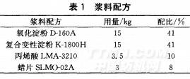 針對棉/漢麻混紡紗線毛羽長且多、比普通棉紗線毛羽偏硬、彈性差等缺點[4],選用青島晟益精細化工有限公司提供的氧化淀粉D-160A和復合變性淀粉K-1800H作為主漿料。氧化淀粉D-160A具有粘度穩定、熱穩定性佳、粘著性和成膜性較好的特點;K-1800H中粘度、漿膜較柔軟、耐磨,分紗佳,易退漿,無污染。丙烯酸LMA-3210的使用會使紗體柔軟滑爽、成膜性較好,也利于毛羽貼伏,較好地改善上漿質量。選用的漿料配方見表1。