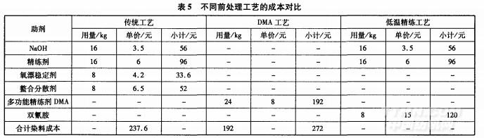 表5中,H202/雙氰胺活化體系低溫練漂工藝漂白1t純棉針織布的染化料成本僅比傳統工藝高34.4元,比DMA工藝高80元。