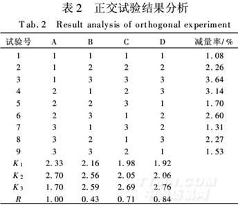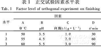 試樣為亞麻織物2g/塊,浴比1∶25,進(jìn)行溫度、pH值、酶用量、時(shí)間四因素的L9(34)正交試驗(yàn),試驗(yàn)因素水平見表1,結(jié)果見表2。