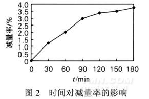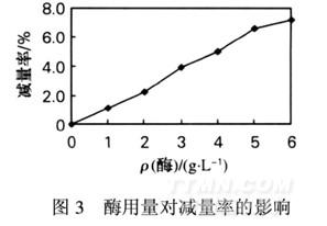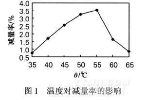 由圖1可見,隨著溫度的升高,減量率逐漸增大,溫度為55℃時(shí),其值最大,之后,隨著溫度的升高減量率下降,溫度為65℃時(shí),減量率不到1.0%。可見,纖維素酶對(duì)溫度非常敏感,因此,在酶處理工藝中,控制溫度尤其重要。
