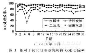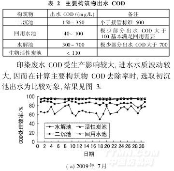 以2009年7~8月份單位自測數據為依據(此階段的生產和廢水處理都較正常,具有一定代表性)分析處理流程的運行效果。廢水接管檢測指標有COD,SS,總磷,氨氮,pH值和色度,其中主要指標為COD。該廠定時測量指標除COD和pH值外,為判斷廢水運行效果,還常測DO(溶解氧)和SV(沉降比)指標,并不定期測量氨氮、總磷和色度(一般通過目測判斷出水顏色深淺)。
