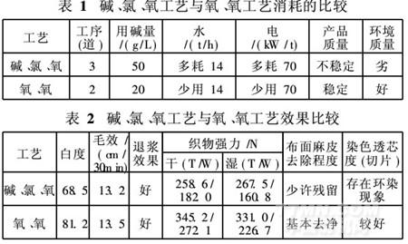 新工藝比原工藝少了一組氯漂工序,而產(chǎn)品質(zhì)量達(dá)到或超過(guò)傳統(tǒng)的堿→氯→氧工藝。采用此工藝比較安全穩(wěn)定,操作也較簡(jiǎn)單。針對(duì)不同質(zhì)量織物的處方變化不大,除增減DK-2外,其它的組分無(wú)需變動(dòng)。
