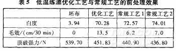 對比低溫練漂優化工藝與常規工藝對棉針織物的前處理效果,結果見表5。