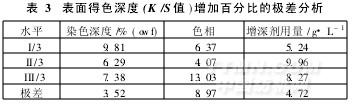 由表3知,增深處理能夠在一定程度上增加染色試樣的表面深度,但是對于不同顏色和染色深度的試樣,其增深程度也不同。其中,色相的不同對于增深效果的影響最大,其次是增深劑的用量,而增深效果與染色深度的關(guān)聯(lián)程度最小。這說明增深處理對于不同顏色的增深作用有差異,對黑色的作用效果比較顯著,而對于黃色的增深效果最差。這對于增深劑應(yīng)用于實際生產(chǎn)有重要的指導(dǎo)意義。