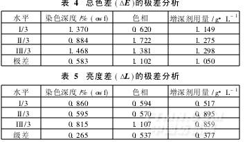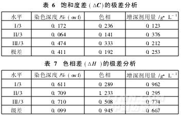 為了詳細(xì)考察增深處理對顏色的綜合影響,我們對處理前后樣品的總色差變化、亮度差變化、飽和度差以及色相差的變化做了極差分析,如表4~7所示