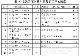傳統皂洗工藝與中和皂洗劑PROTE(-SPERSENRC工藝及酸度的對比見表3。