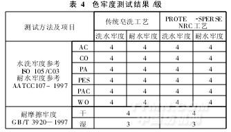 (1)使用PROTE(-SPERSE NRC皂洗后,水洗、耐水及摩擦牢度與常規皂洗工藝相同。