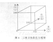我們對羊絨織物印花顏色采用的色卡調(diào)色法,色卡調(diào)色法是通過對比色卡中的顏色來調(diào)色。其基本過程為:首先,制作色卡文件。可以選擇一種或幾種顏色模式來建立色卡模型,色卡模型為一個三維立體(LAB模式和RGB模式)或一組三維立體(CMYK模式),如圖1所示。
