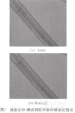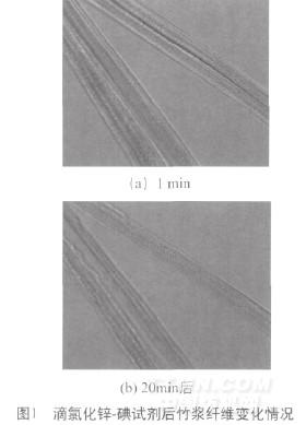 竹漿纖維在氯化鋅-碘試劑作用下,1min時沒有出現變化,如圖1(a)所示,隨著時間的延長,竹漿纖維逐漸呈墨綠色,且出現膨脹,約在20min后纖維表面的溝槽及棱子逐漸溶解,纖維逐漸變細,如圖1(b)所示。竹原纖維經氯化鋅-碘試劑作用后,纖維呈淡淡的藍青色,30min內纖維外觀沒有出現明顯變化,如圖2(a)、(b)所示。兩種纖維素纖維經氯化鋅-碘試劑處理后出現了明顯不同的特性,這與其兩種纖維的結晶度不同有關,已有文獻報道[1]竹漿纖維的結晶度低于竹原纖維,結晶度高的竹原纖維內部空隙小,分子難以滲透進入纖維內部區域,因此,氯化鋅-碘試劑對竹原纖維處理的影響較小;相反,結晶度相對比較低的竹漿纖維內部空隙比較大,分子也比較容易滲透進入纖維內部區域,纖維經氯化鋅-碘試劑處理后出現溝槽及棱子溶解現象。