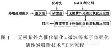 無極紫外光催化氧化+微波等離子體強化活性炭吸附技術”工藝流程見圖1。