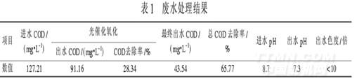 該公司的印染廢水經物化預處理后由污水泵泵入無極紫外光催化氧化反應器進行處理,再經微波等離子體強化活性炭吸附反應器處理。該設備經過5d左右的調試,設備運轉正常,達到100t/d(按8h/d計)的處理能力。連續3個月對系統進出水水質進行了監測,處理效果平均值見表1。