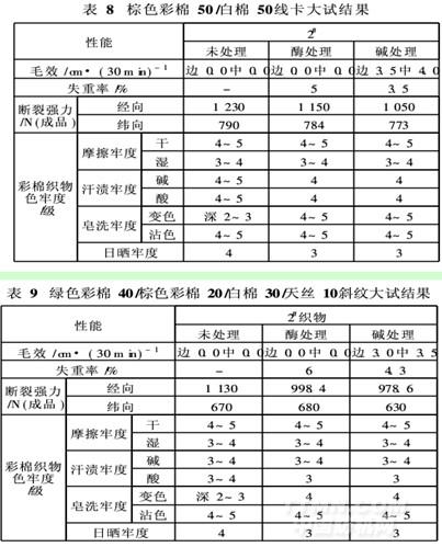 大試結果和小試結果基本相同(見表8、9)。對于棕色彩棉來說,采用堿退漿工藝可以得到深色效應。在大試中還發現,如果加工條件有波動,尤其是停車,堿退漿會產生色檔;而酶退漿的影響很小,不會產生明顯的色檔。綠色彩棉混紡織物在堿退漿時,相對酶退漿工藝來說綠色色光消除明顯。所以彩棉織物若有綠色彩棉成分,必須采用酶退漿工藝。