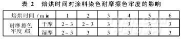 按1.2.1進行涂料染色,黏合劑用量為100g/焙烘溫度160℃,改變焙烘時間,并按1.3.1測定染織物的耐摩擦色牢度,結果見表2。