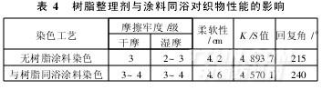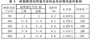 (2)樹脂和涂料進行同浴染色,可提高涂料染織物的耐摩擦色牢度,但其柔軟性和K/S值有所下降