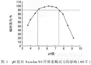 2.1 pH值對纖維素酶EurolanNC活力的影響溫度60℃條件下,測試pH值對纖維素酶EurolanNC活力的影響,結果見圖1。