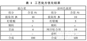 對不同的拔染劑、各種助劑的配比試驗,比較其印花效果,獲得優化配方,如表1所