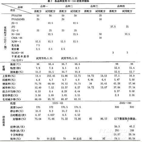 為了驗證低粘漿料的使用效果,該廠做了對比, 將原配方中的JFJ用H一100等量代換一部分,配方及試驗數(shù)據(jù)見表2,其中品種一、品種二、品種三是已有的經(jīng)驗品種,品種四為現(xiàn)用配方。試驗采用常規(guī)調(diào)漿方法。
