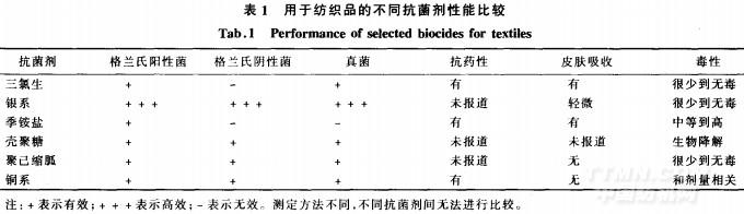 微量的、相對無毒的金屬具有殺滅病原體和防止它們增殖的“微量作用效應(yīng)”。在所有金屬中,銀最具微量生物活性。銀的使用最早可以追溯到l8世紀(jì)使用硝酸銀治療胃潰瘍[1 ]。l9世紀(jì)第1次確定了銀離子的抗菌活性,到了20世紀(jì)20年代,膠體銀由于可以有效地處理傷口而被美國食品藥品署(FDA)認(rèn)可[2-3]。與其他抗菌劑相比,銀系抗菌劑具有抗菌性能高(見表1),不易產(chǎn)生抗藥性的特點,具有很高的安全性。在溫暖潮濕的環(huán)境里,銀離子具有非常高的生物抗菌活性。同時,銀系抗菌劑還具有很多優(yōu)點,如對皮膚沒有刺激性,不影響紡織品的服用性能,因此銀系抗菌劑適合于抗菌功能紡織品的制備[4-5]