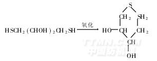 在使用帶巰基的還原劑,即巰基乙酸(HSCH2COOH)、β-乙硫醇(HSCH2CH2OH)和1,4-二巰基丁二醇[HSCH2(CHOH)2CH2SH]作拆鍵劑的三種試驗中,前兩種屬平衡反應,使用時必須過量,而這又使拉伸羊毛條隨后的定形發生困難;而1,4-二巰基丁二醇經氧化后可形成穩定的六元環,見下式[1]: