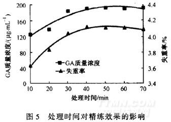 不同酶精練時間的試驗結果如圖5所示。由圖可知,處理時間達到40min以后,織物的精練效果不再有明顯的提高。一方面,果膠酶在水溶液中滲透表皮,透過縫或微孔與基質中的果膠接觸,果膠物質借助于酶而裂解,隨著時間的增加,果膠物質裂解增多,酶解產物中的GA質量濃度和織物失重率也同步增加;另一方面,隨著處理時間的延長,熱喪失活力的酶分子在總酶量中的比例逐漸增大,并