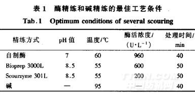 按上述試驗方法及步驟用諾維信2種商品酶在棉針織物上作最佳工藝條件試驗。根椐試驗得出精練酶Scourzyme301L以及堿性果膠酶Bioprep3000L處理18.2tex純棉針織物的最佳工藝條件,其結果如表1所示
