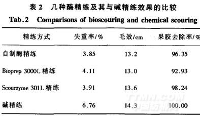 好于諾維信的2種產品。從用量上來看,由于商品酶Scourzyme301L是復配酶制劑,精練時存在著多種酶的協同作用,所以果膠酶的用量較少(精練浴體系中維持200U/L的堿性果膠酶)。而自制酶的用量