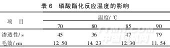 選擇開環反應和縮合反應的最佳工藝條件,以最終產物的物化性能指標及應用性能來確定磷酸酯化反應的溫度和時間條件,結果見表6及7。