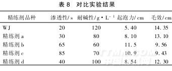 (1)精練劑WJ具有良好的滲透性、耐堿性,以及良好的乳化分散性和凈洗性能。用其配制的溶液穩定,不漂油,不凝聚,不分層,且泡沫較低。有利于節約能源,降低成本。