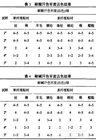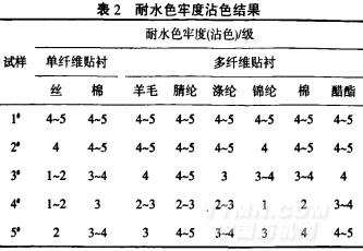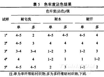 有些色牢度較好的織物,在所有纖維貼襯上的沾度均較好,如表2、表3中1。試樣耐水與耐酸汗度在所有纖維貼襯上的沾色牢度均為4~5級.